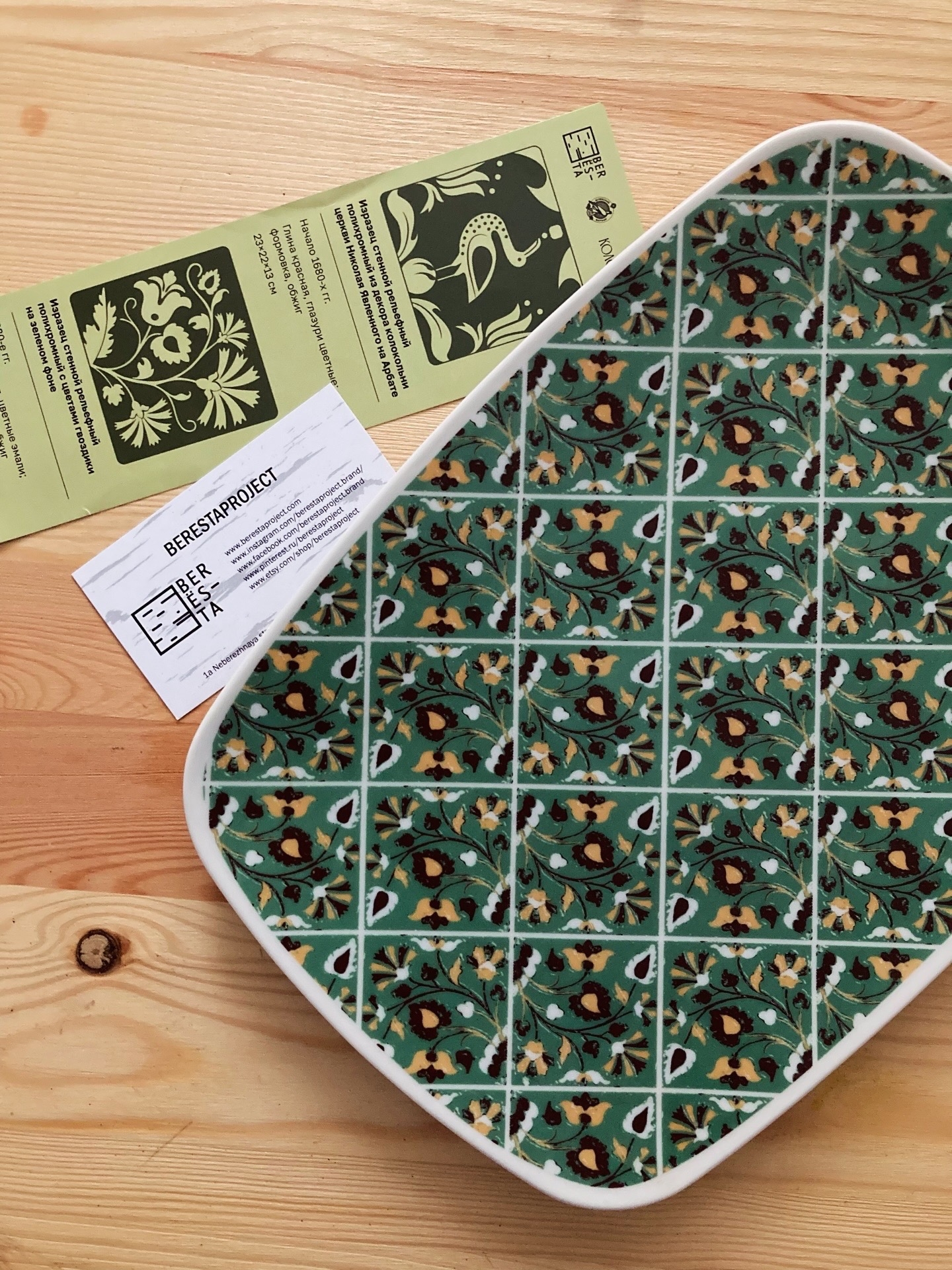 В коллекции «Изразец» по мотивам изразцов 1670г. из фондов музея-заповедника и рисунком деколью на фарфоре представлены кружки малые (7*7, 190мл) и большие (12*8, 420мл) и вазы фарфоровые с берестой (25*10, 1500мл), блюда керамические (27*19) в двух принтах: с гвоздикой и с птицами на зеленом фоне. В двух принтах: с гвоздиками и птицами на зеленом фоне.