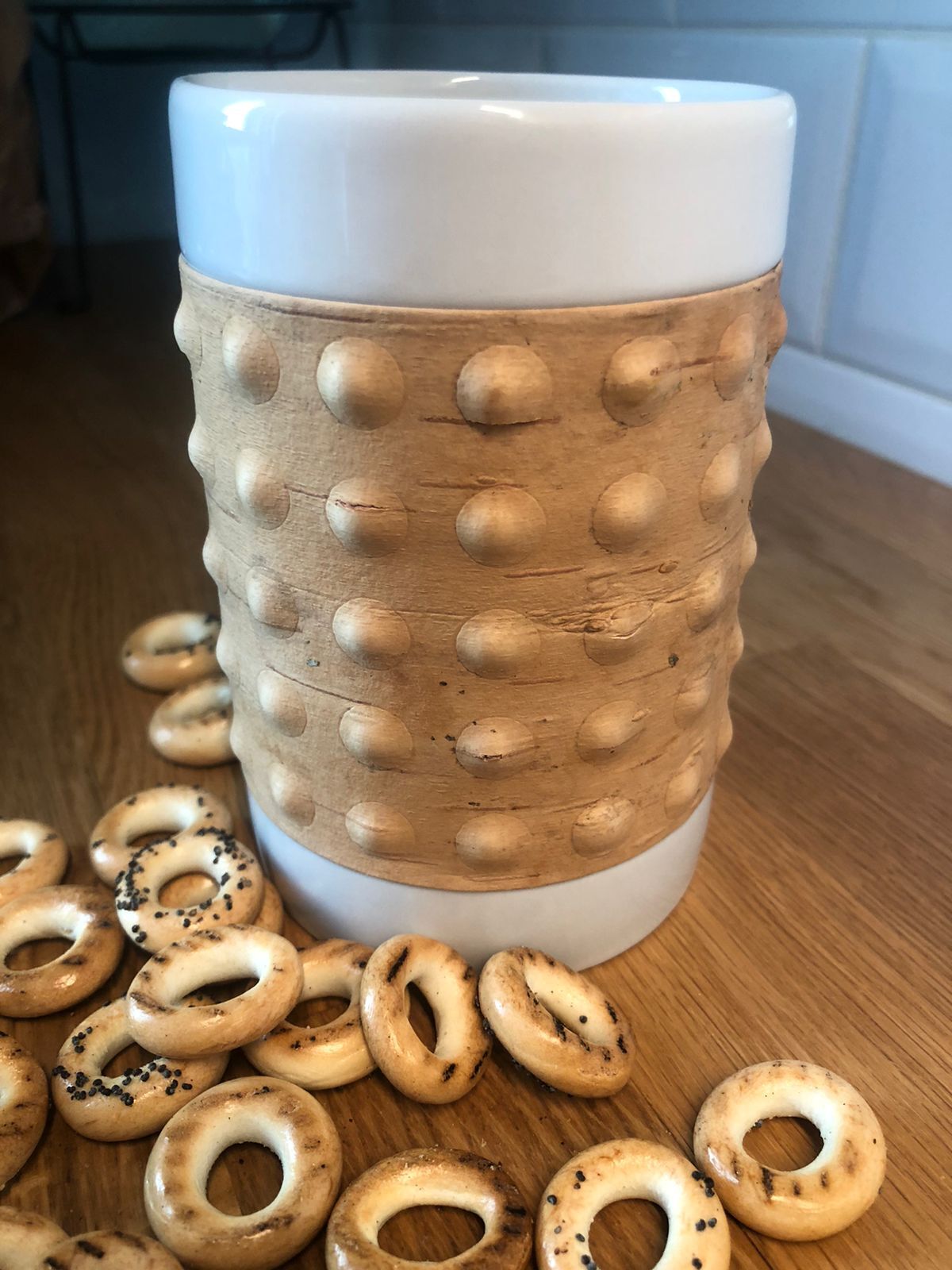 Коллекция Dots — это дань модернизму, выраженная в простоте и функциональности. Вставка из бересты с упорядоченным простым рисунком подчеркивает логику конструкции изделия и его функциональность. Изделие удобно в использовании, узор не позволяет кружке выскользнуть из рук. Предметы коллекции легко вписываются в современный интерьер. Отличное решение для домашнего использования!