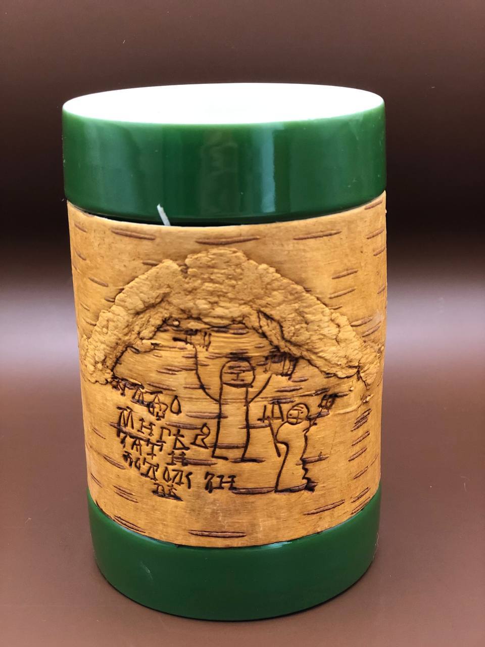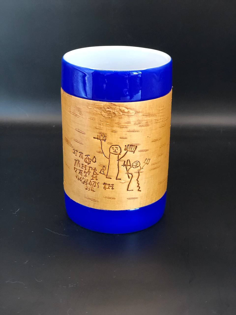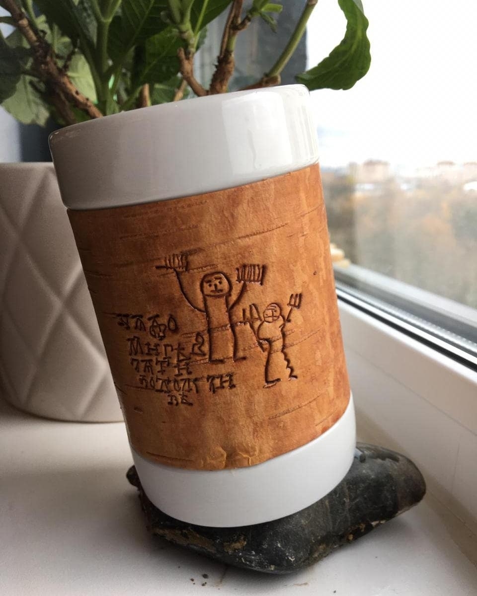 Kружка большая (без ручки) размером 12х8х9, объемом 420мл и весом 500г рекомендована для чаепития, и может использоваться как малая ваза для цветов или органайзер для ручек и карандашей, а также для иных целей в интерьере дома или офиса или загородного дома. Кружку можно держать горячей в руках, не боясь обжечься; мыть в воде, не снимая бересту и ставить в посудомоечную машину или микроволновку. Кружка упаковывается в картонную коробку, но для дальнего почтового отправления мы рекомендуем заказывать фирменный тубус, что гарантирует большую ее сохранность.