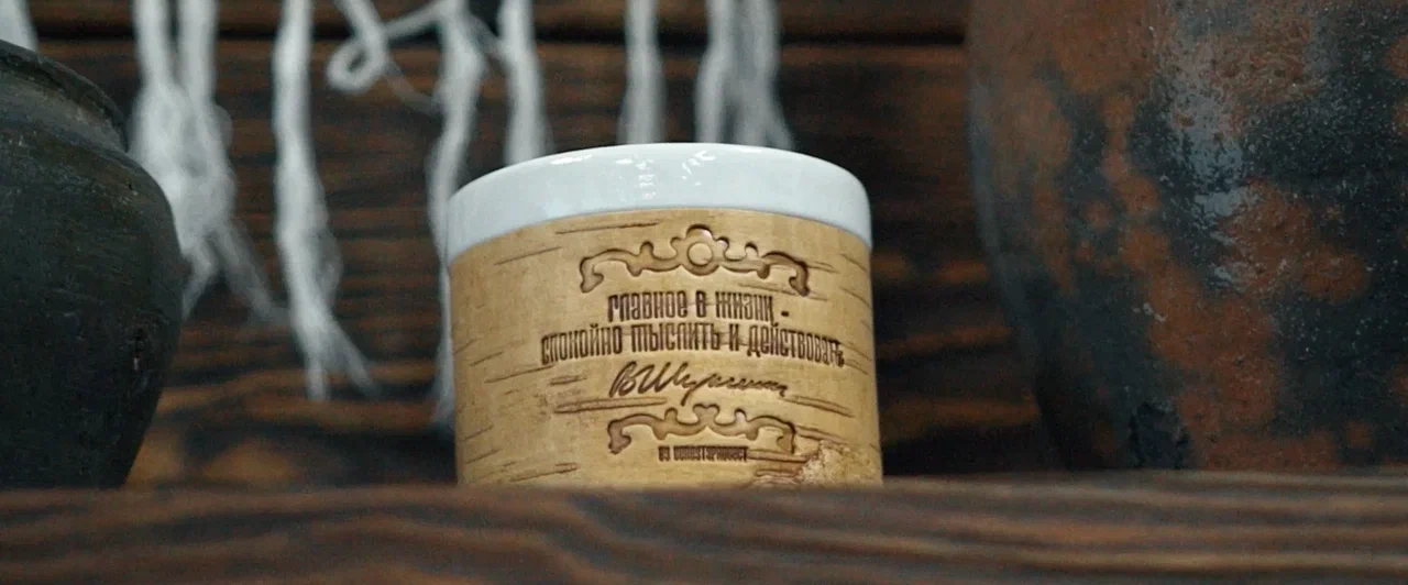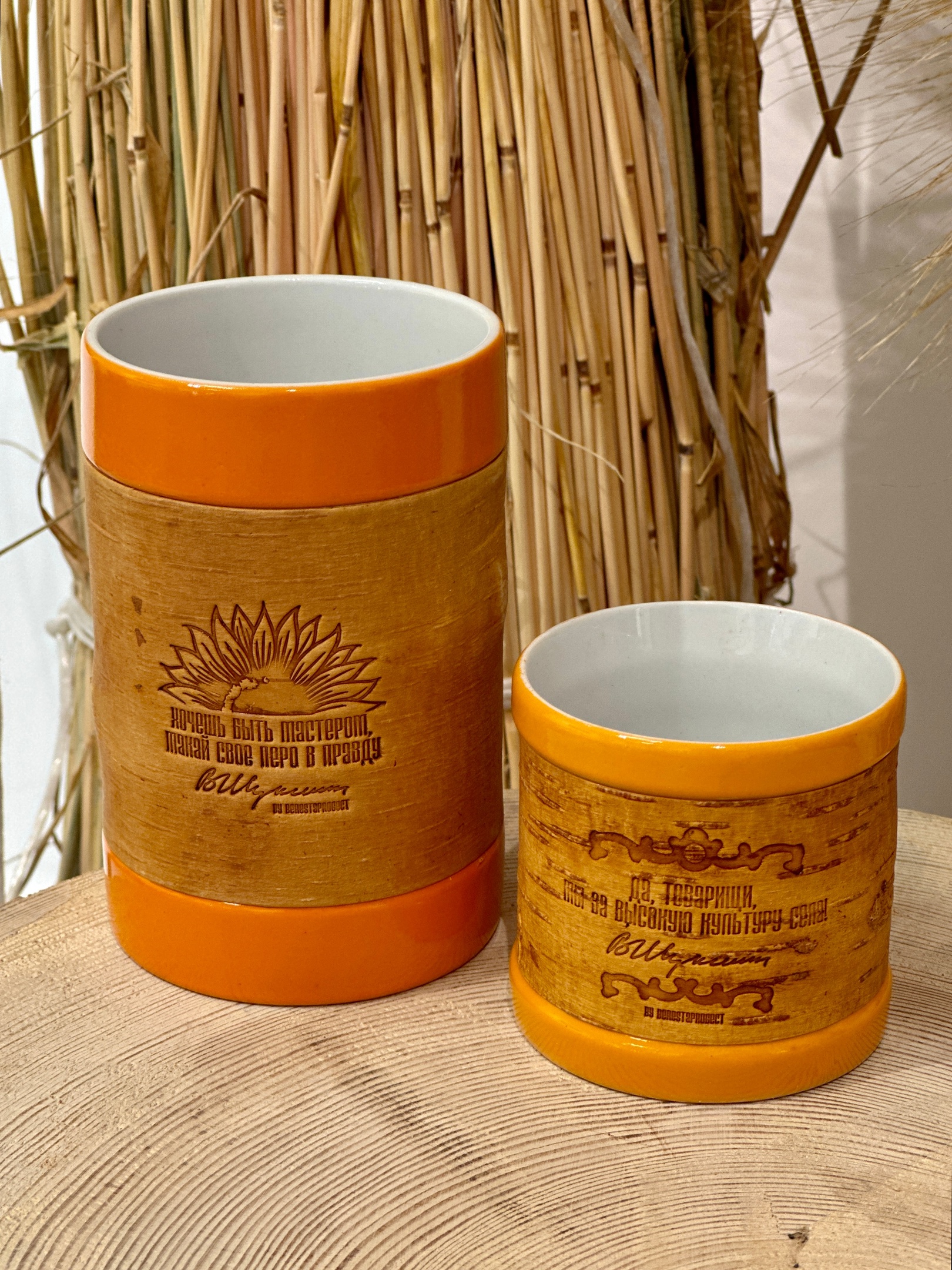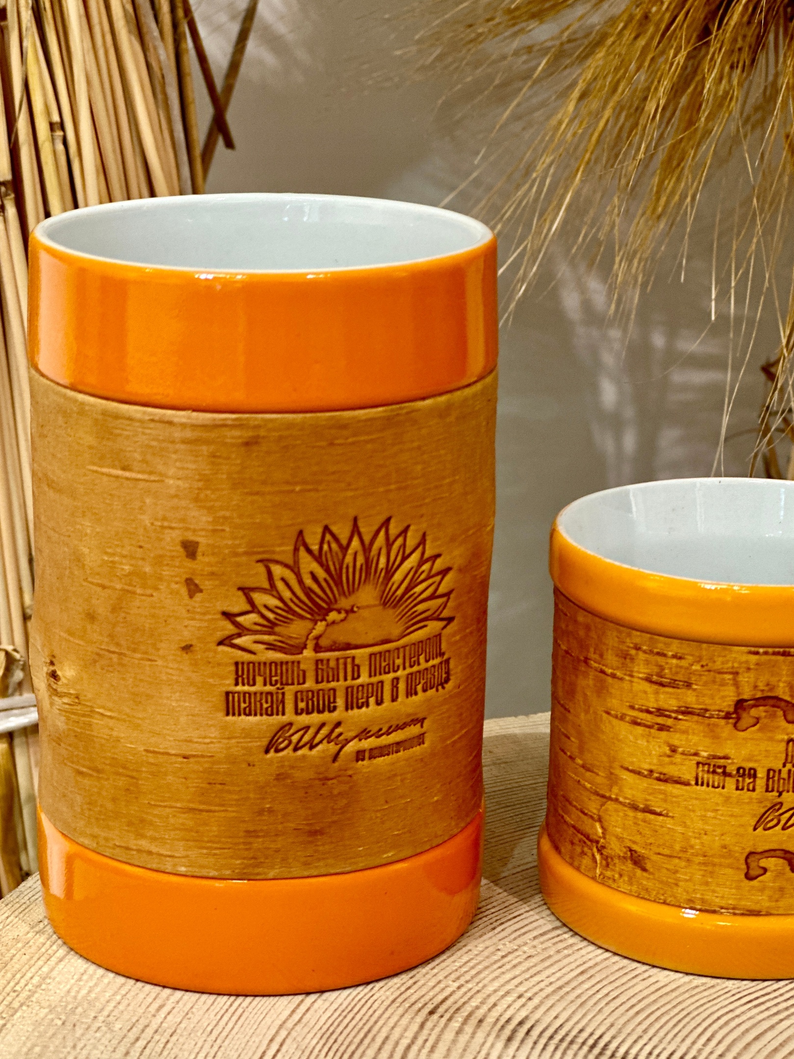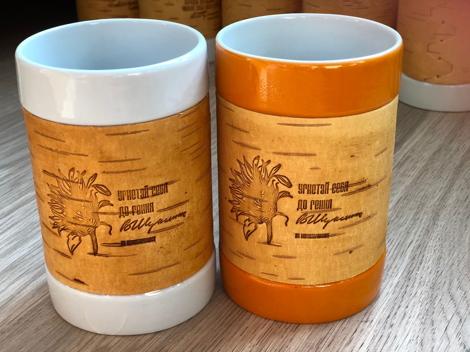 Кружка большая фарфоровая без ручки с цитатами В.М. Шукшина на бересте.