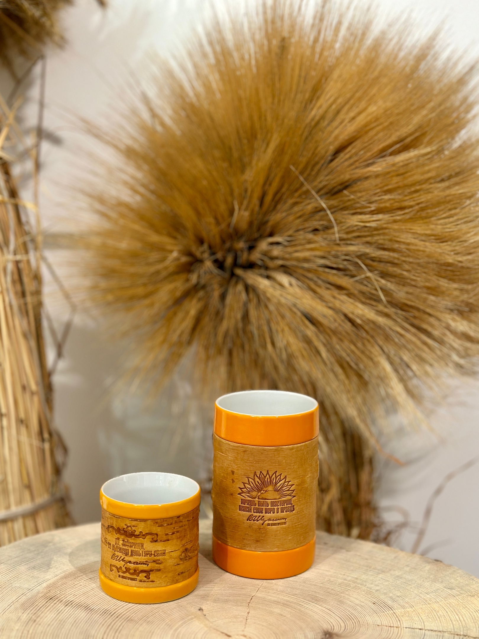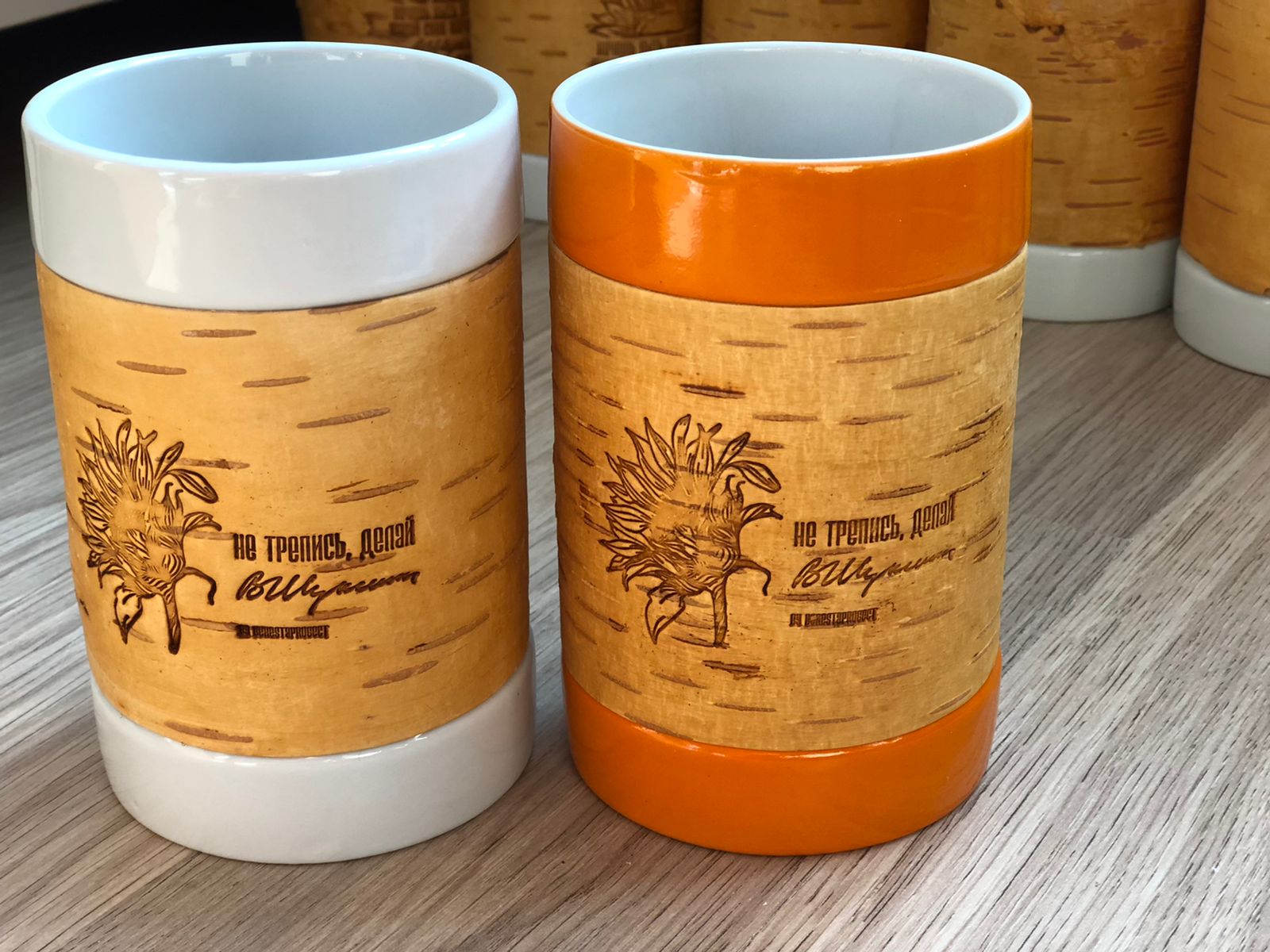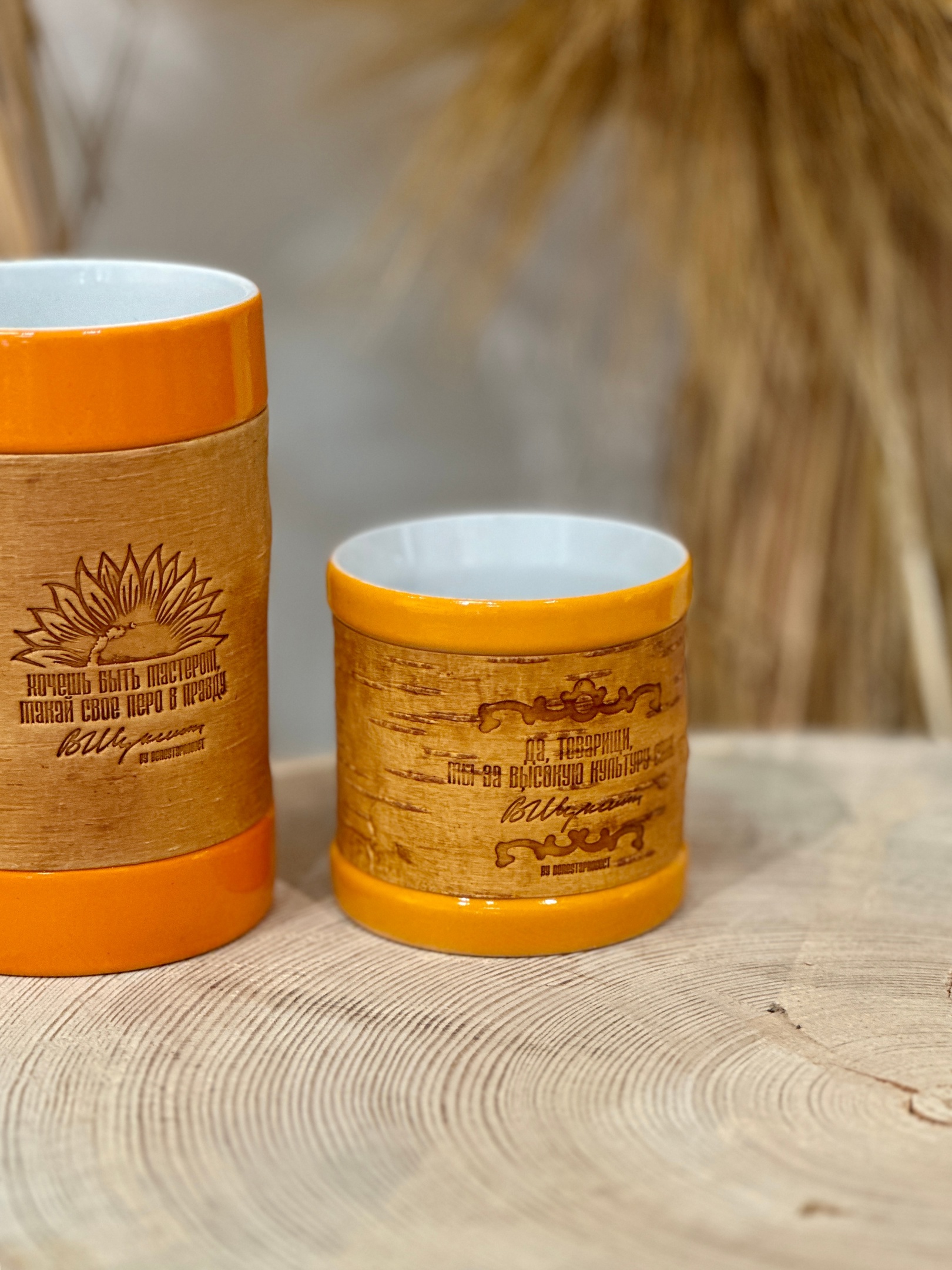 Design mug, porcelain & birch bark. Pouchkin forever.