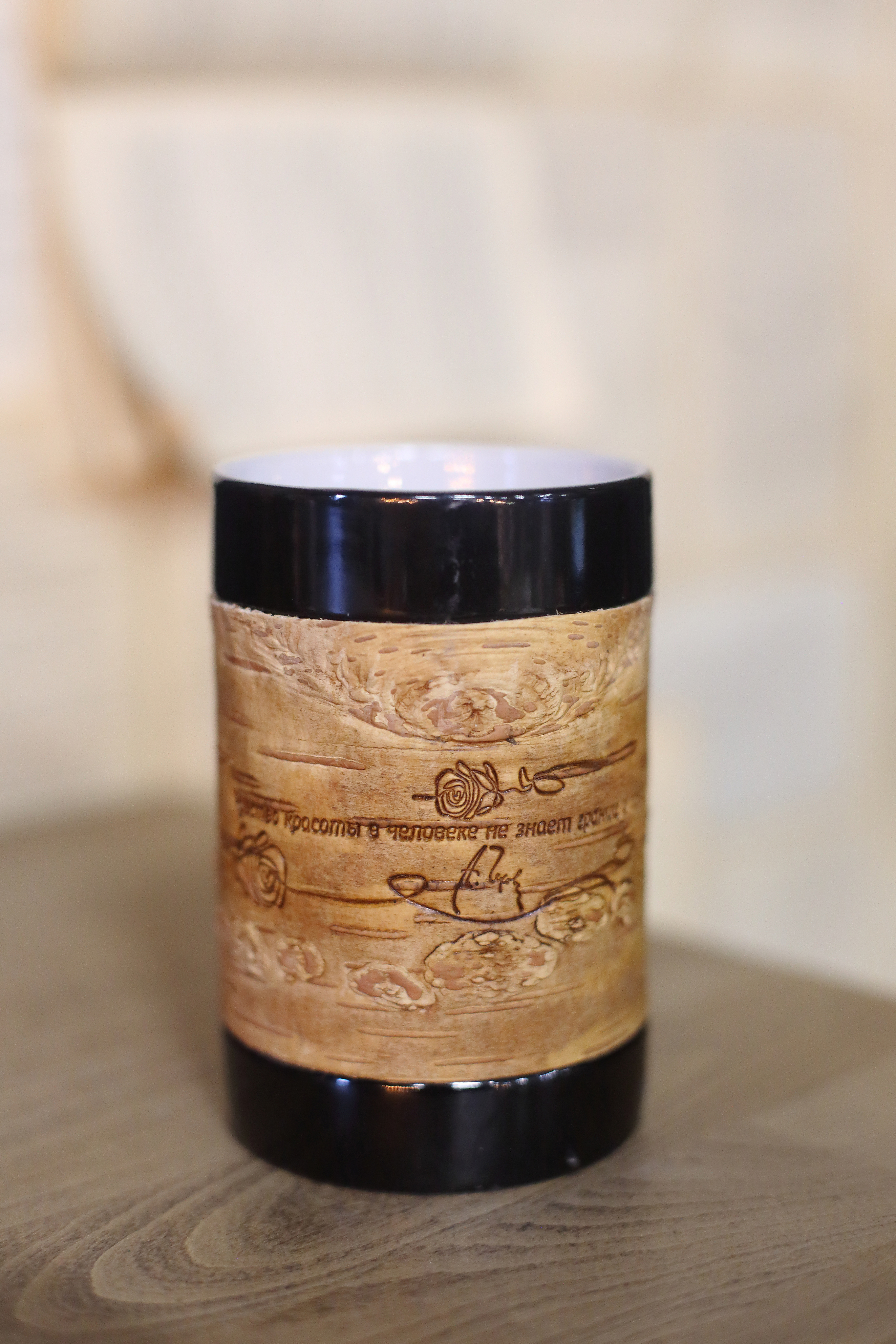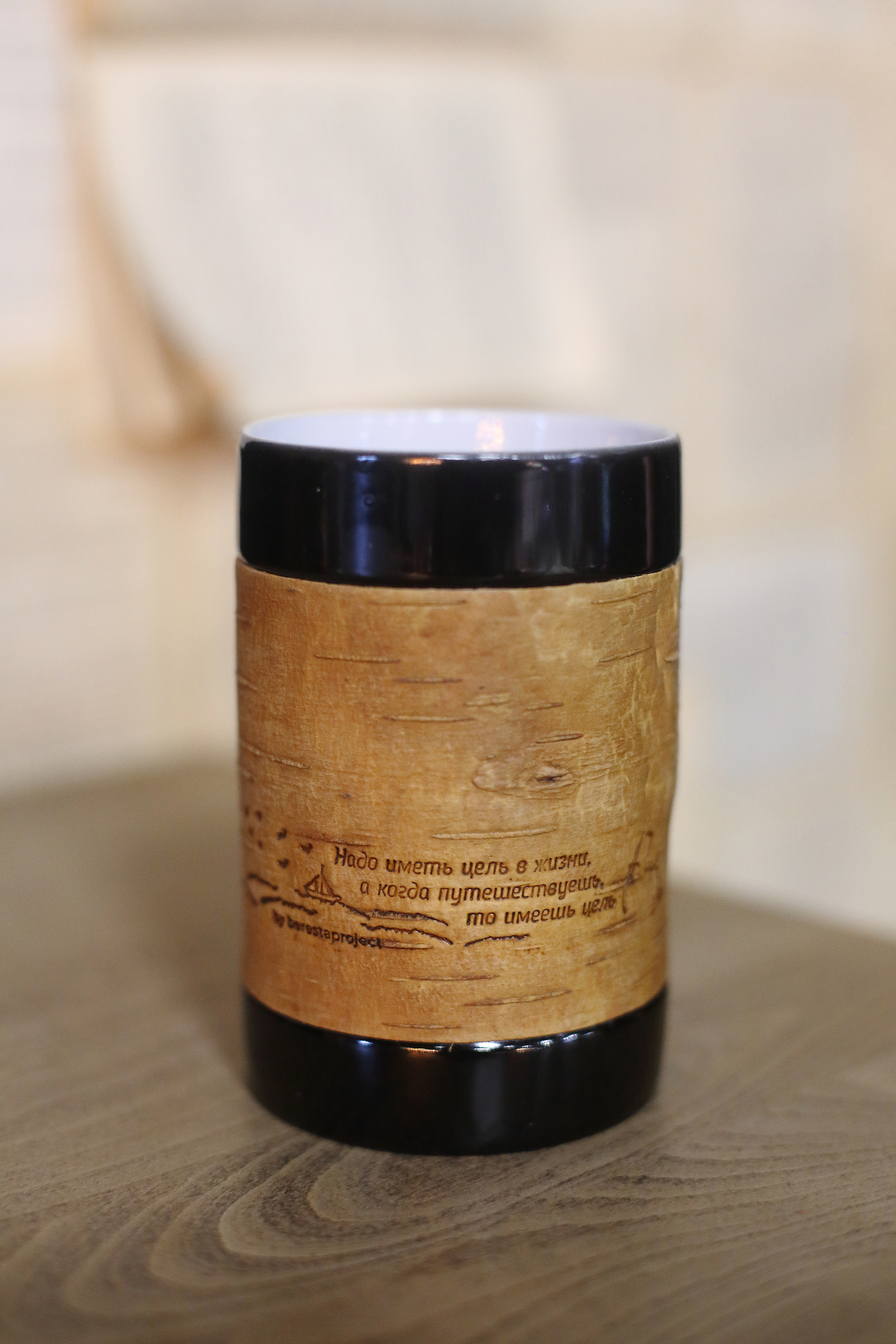 Kружка большая (без ручки) размером 12х8х9, объемом 420мл и весом 500г рекомендована для чаепития, и может использоваться как малая ваза для цветов или органайзер для ручек и карандашей, а также для иных целей в интерьере дома или офиса или загородного дома. Кружку можно держать горячей в руках, не боясь обжечься; мыть в воде, не снимая бересту и ставить в посудомоечную машину или микроволновку. Кружка упаковывается в картонную коробку, но для дальнего почтового отправления мы рекомендуем заказывать фирменный тубус, что гарантирует большую ее сохранность.