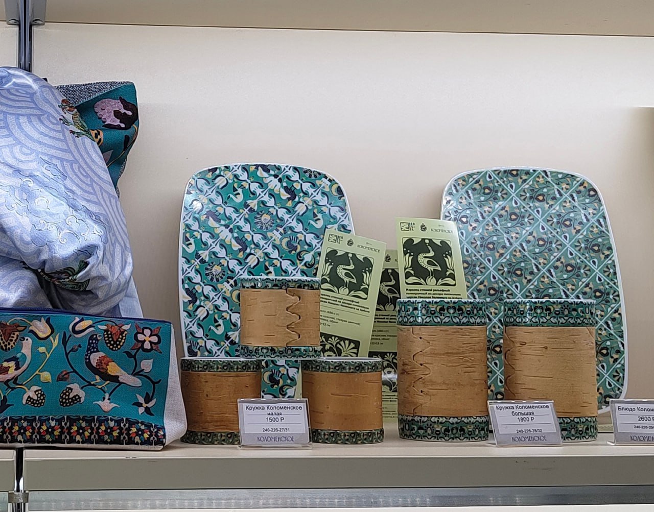 В коллекции «Изразец» представлены кружки малые (7*7, 190мл) и большие (12*8, 420мл) и вазы фарфоровые с берестой (25*10, 1500мл), блюда керамические (27*19) в двух принтах: с гвоздикой и с птицами на зеленом фоне. В двух принтах: с гвоздиками и птицами на зеленом фоне.