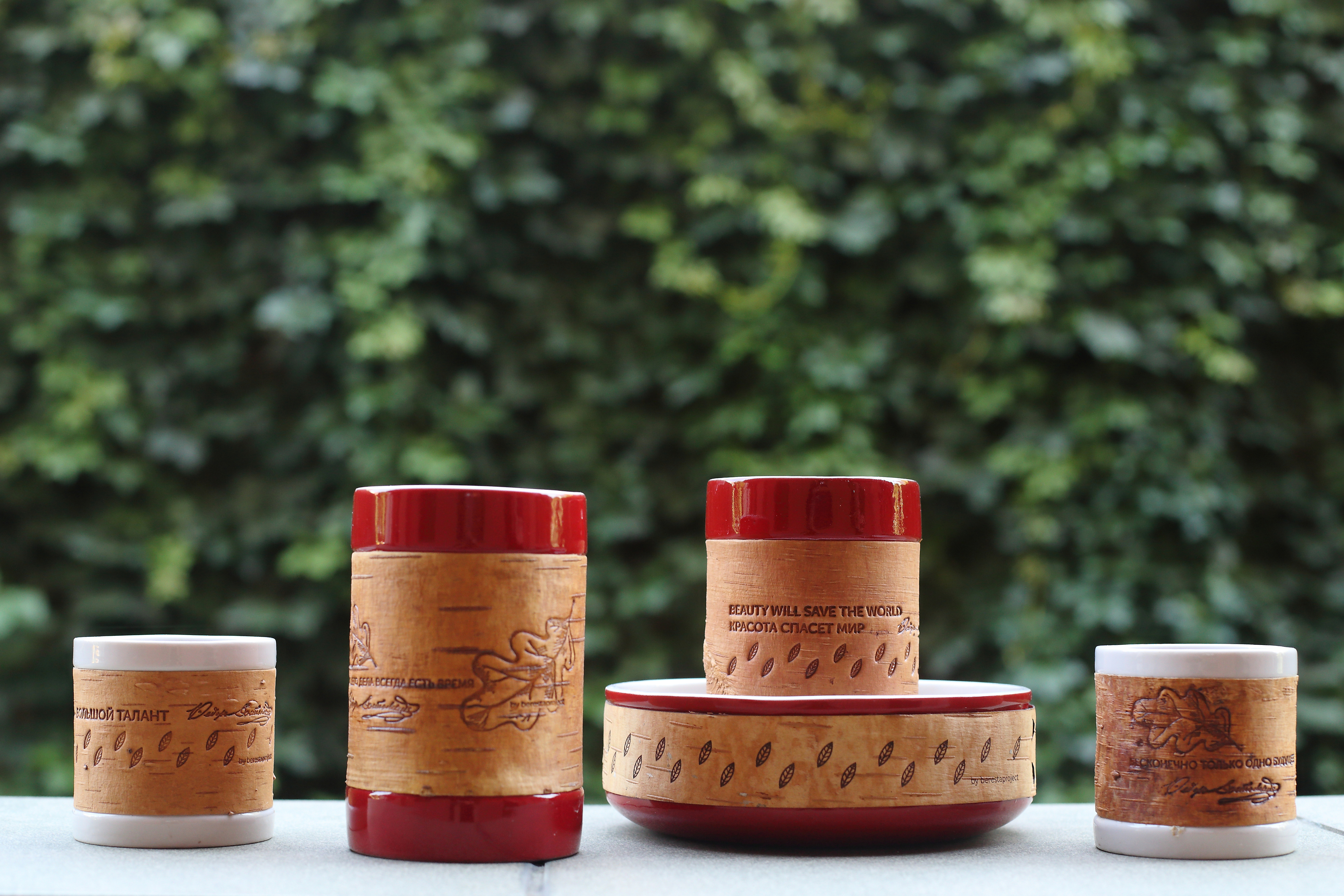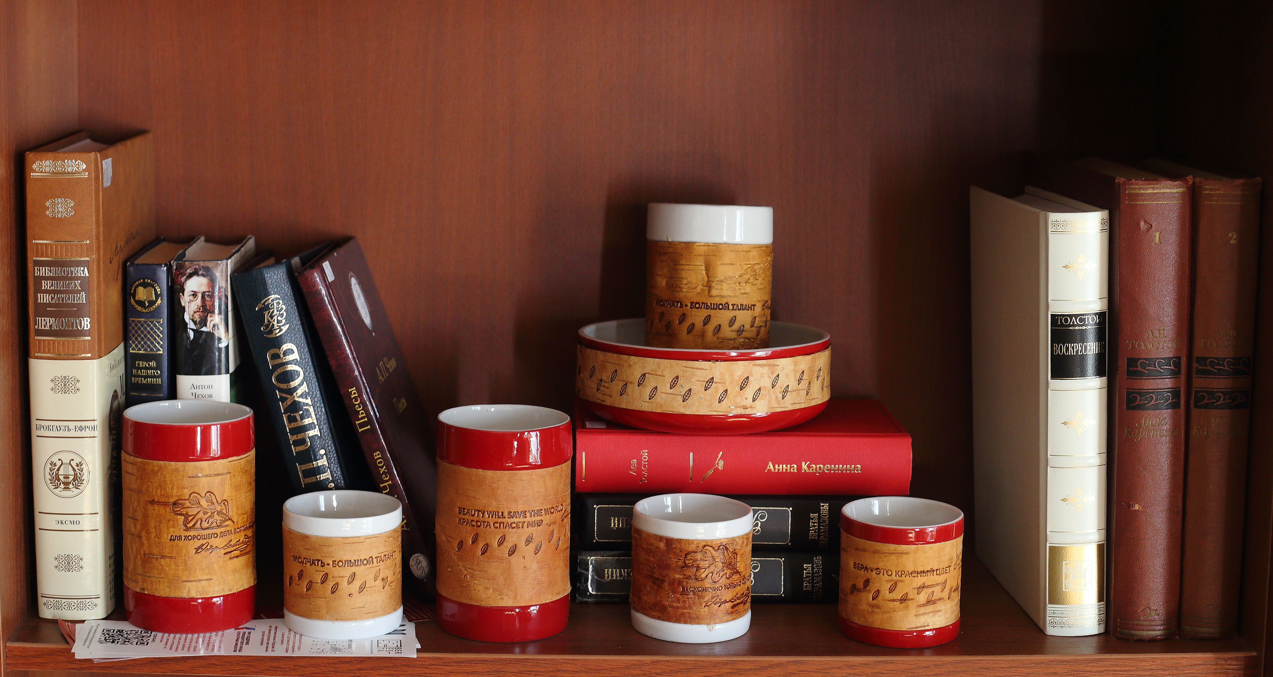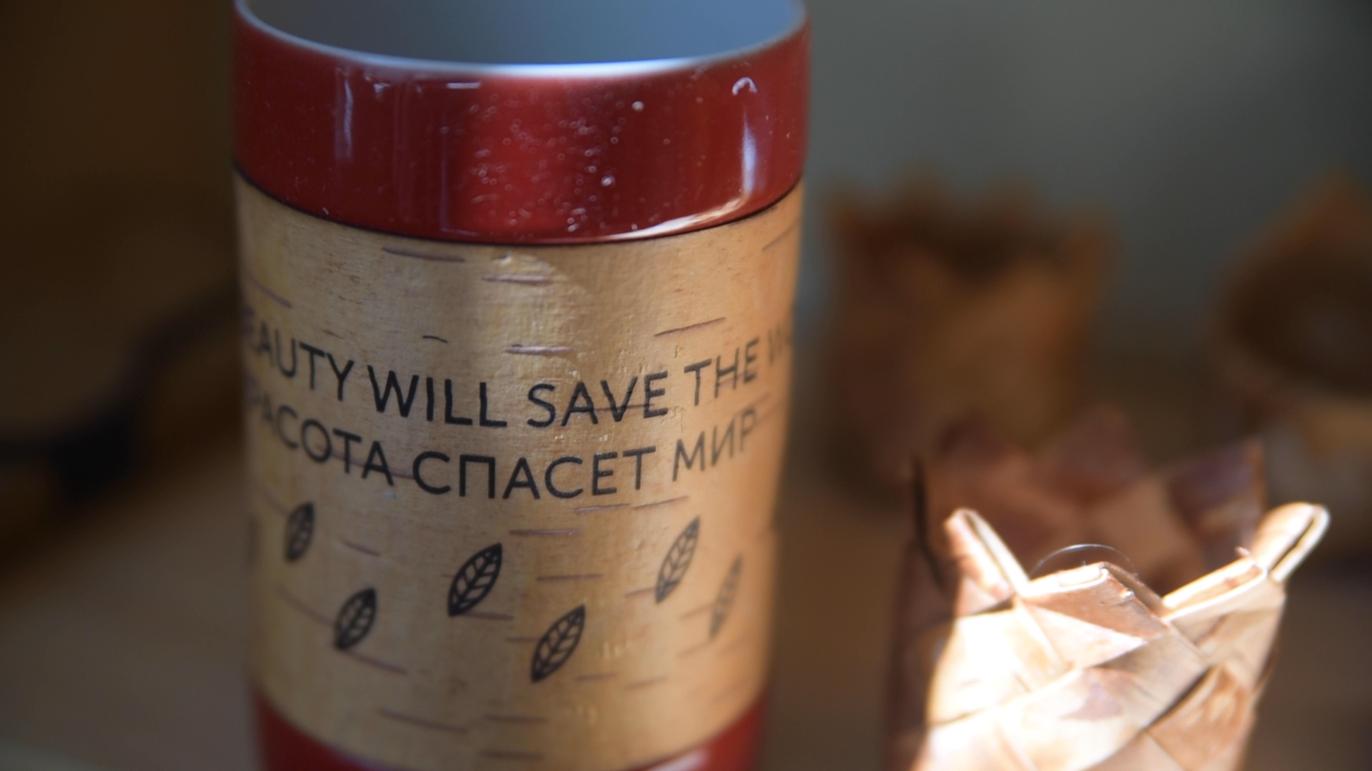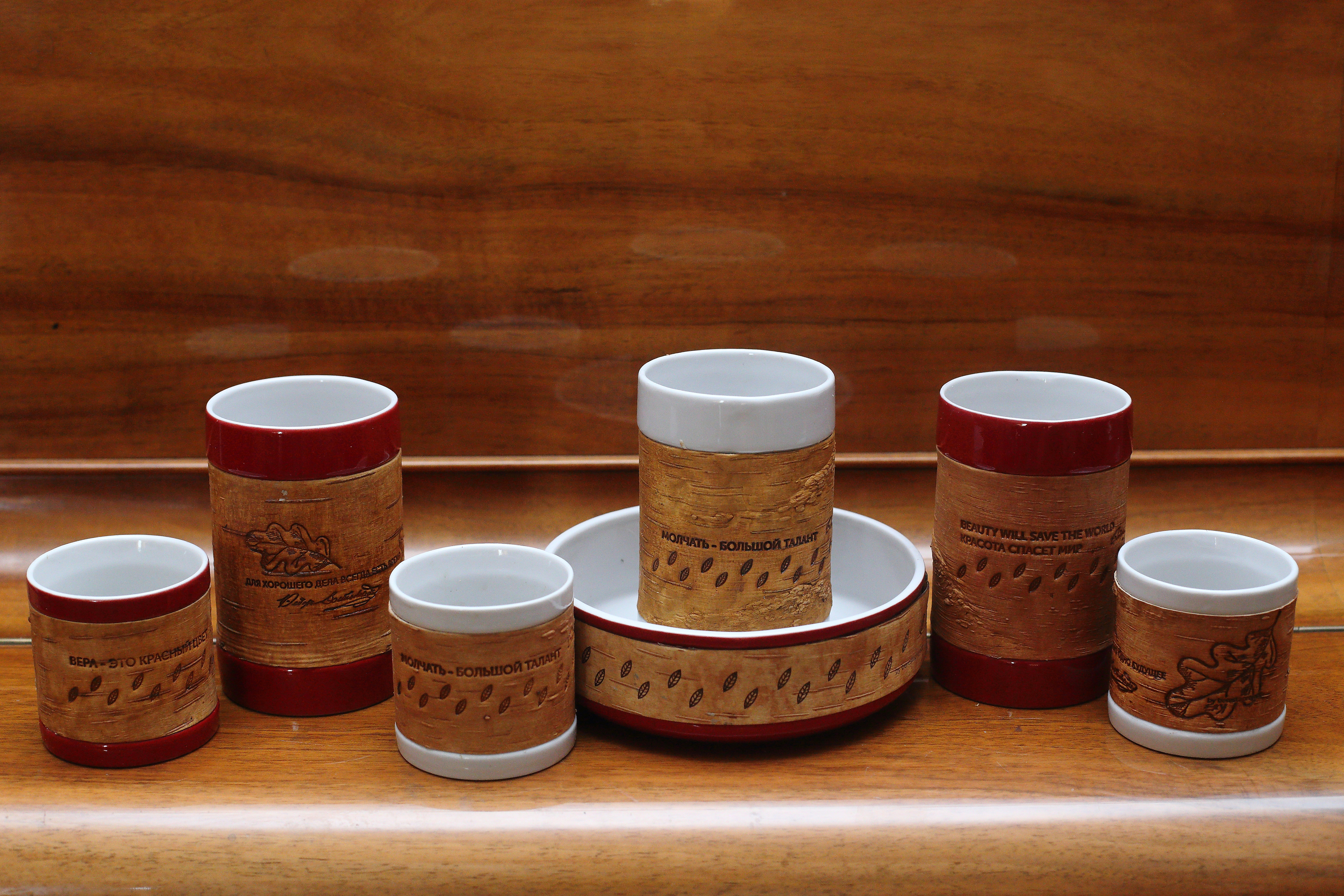 В коллекции Достоевского мы создали 3 принта: с бузиной, дубовым листом и мелкими листьями калины по мотивам растений, встречающихся в произведениях автора и его усадьбе. Для пиалы мы выбрали принт с листьями калины. Именно этот вариант литературных коллекций был отобран на выставку "Придумано и сделано в России" и экспонировался во Всероссийском Музее Декоративного Искусства. Цитаты в данном случае на бересту не наносятся.