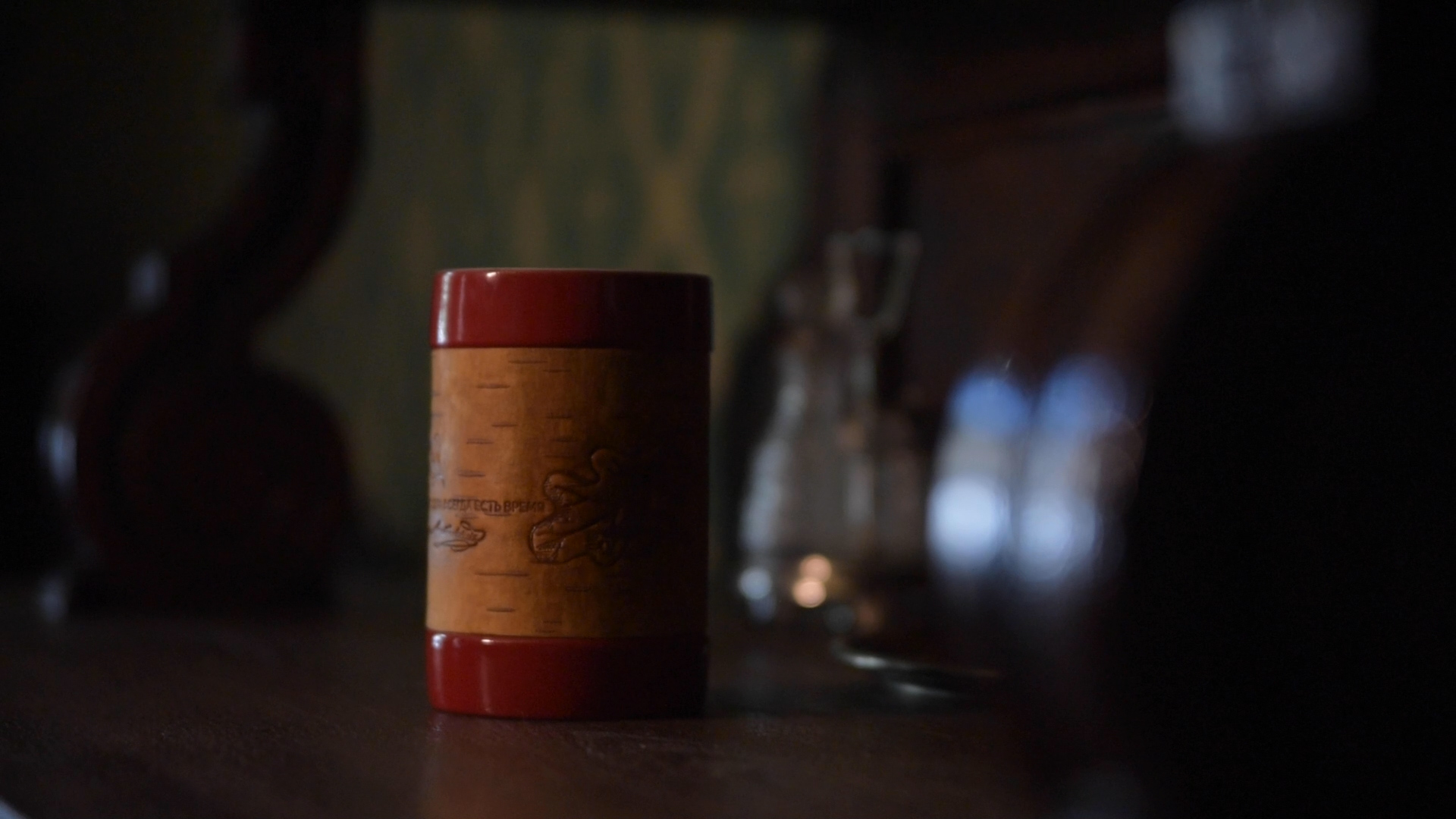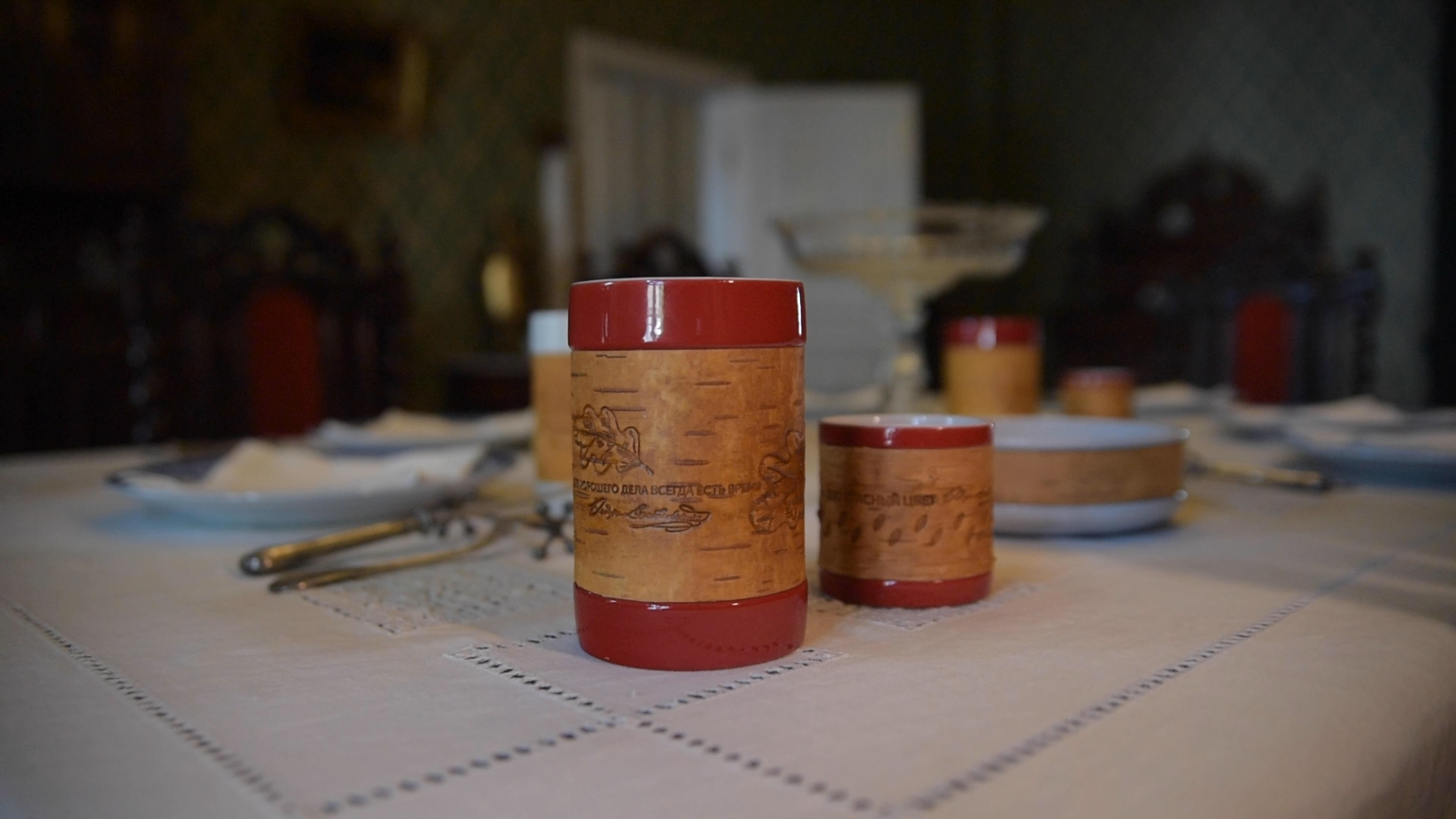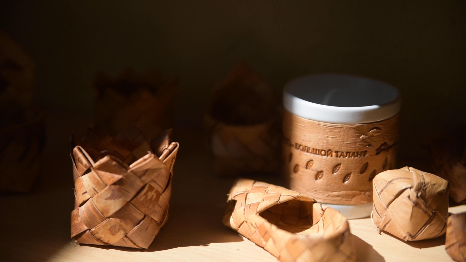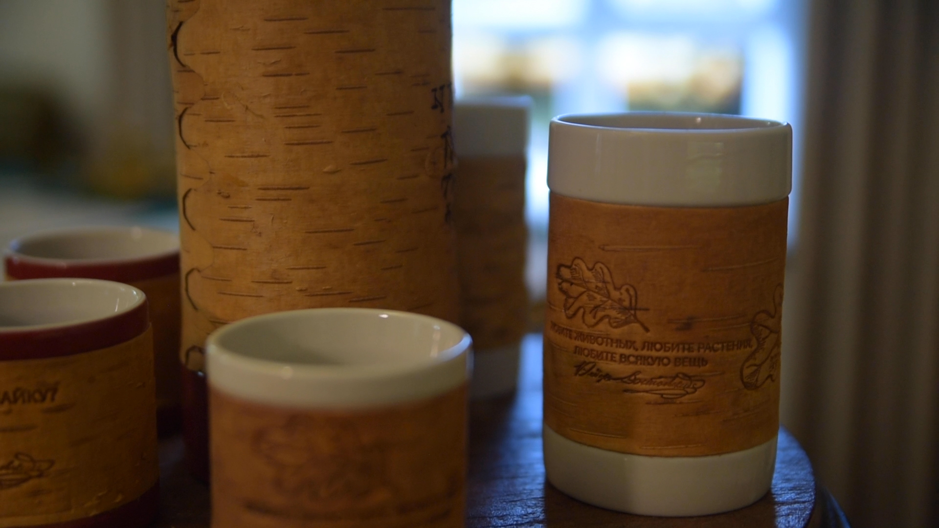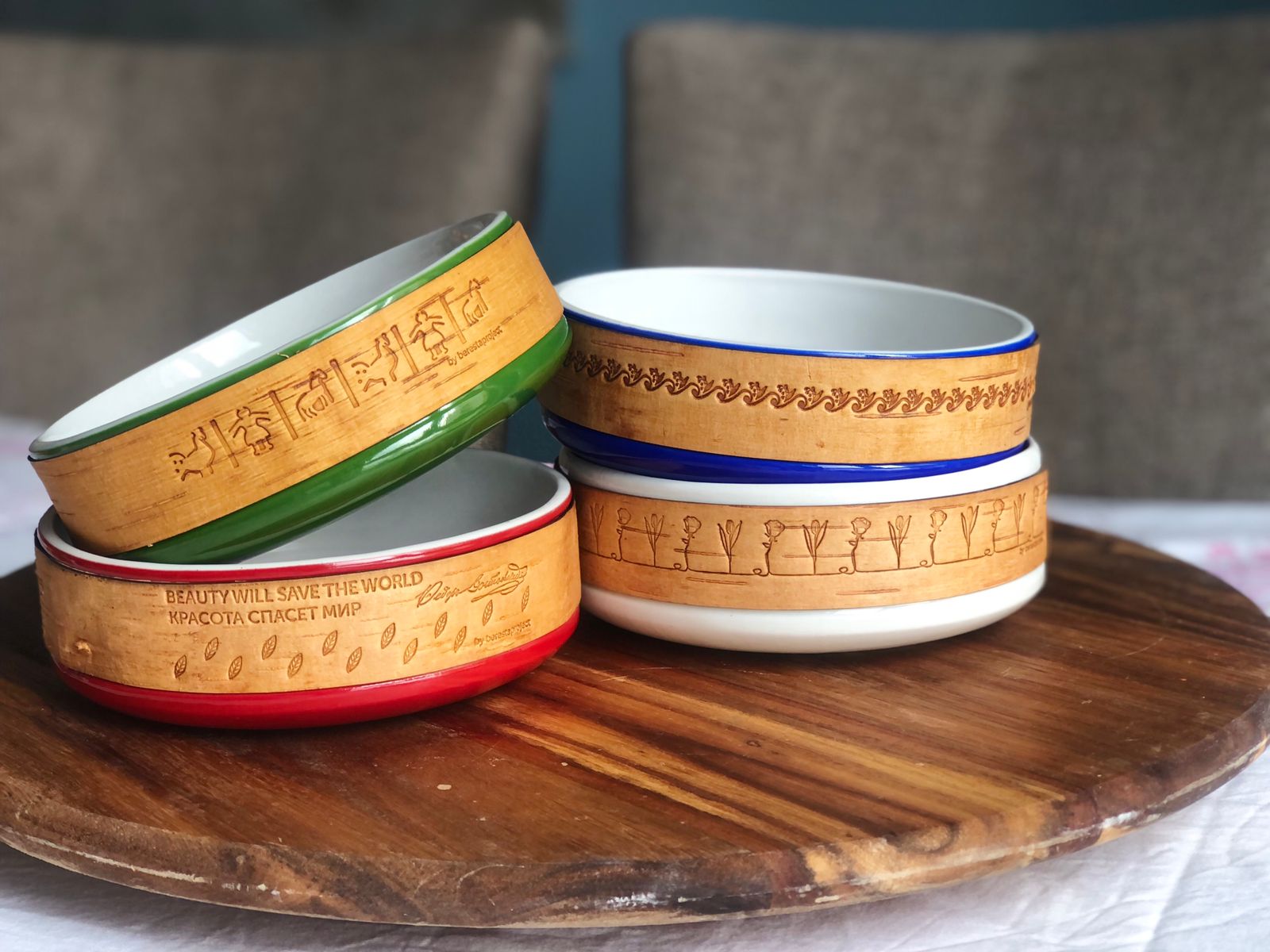 В коллекции Достоевского мы создали 3 принта: с бузиной, дубовым листом и мелкими листьями калины по мотивам растений, встречающихся в произведениях автора и его усадьбе. Для пиалы мы выбрали принт с листьями калины. Именно этот вариант литературных коллекций был отобран на выставку "Придумано и сделано в России" и экспонировался во Всероссийском Музее Декоративного Искусства. Цитаты в данном случае на бересту не наносятся.