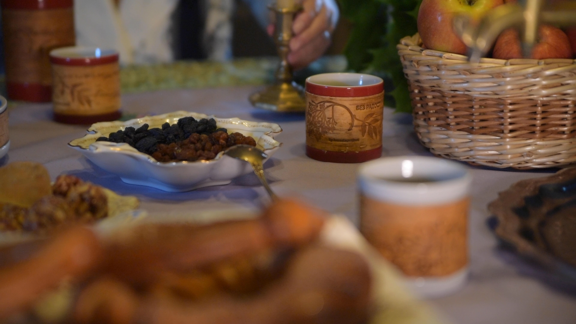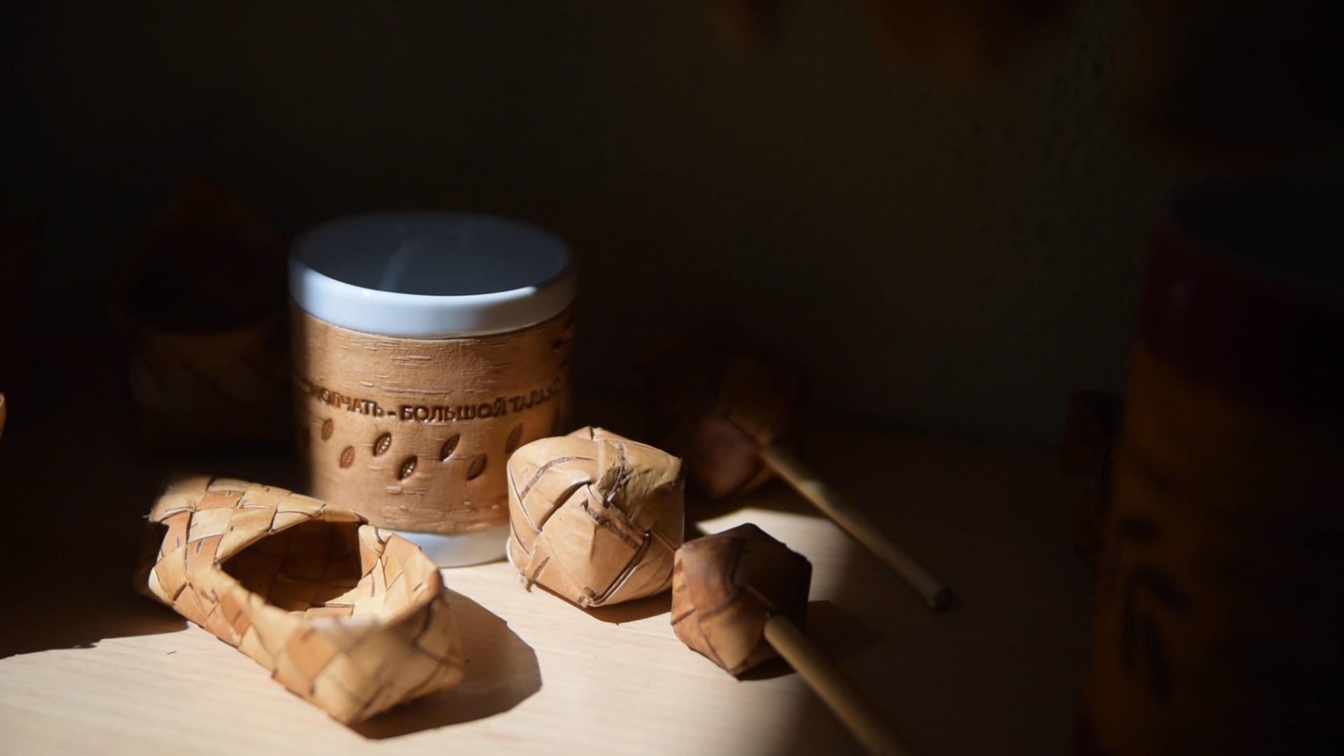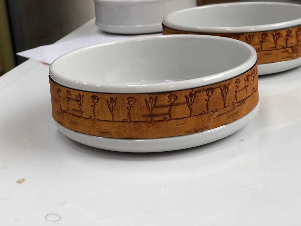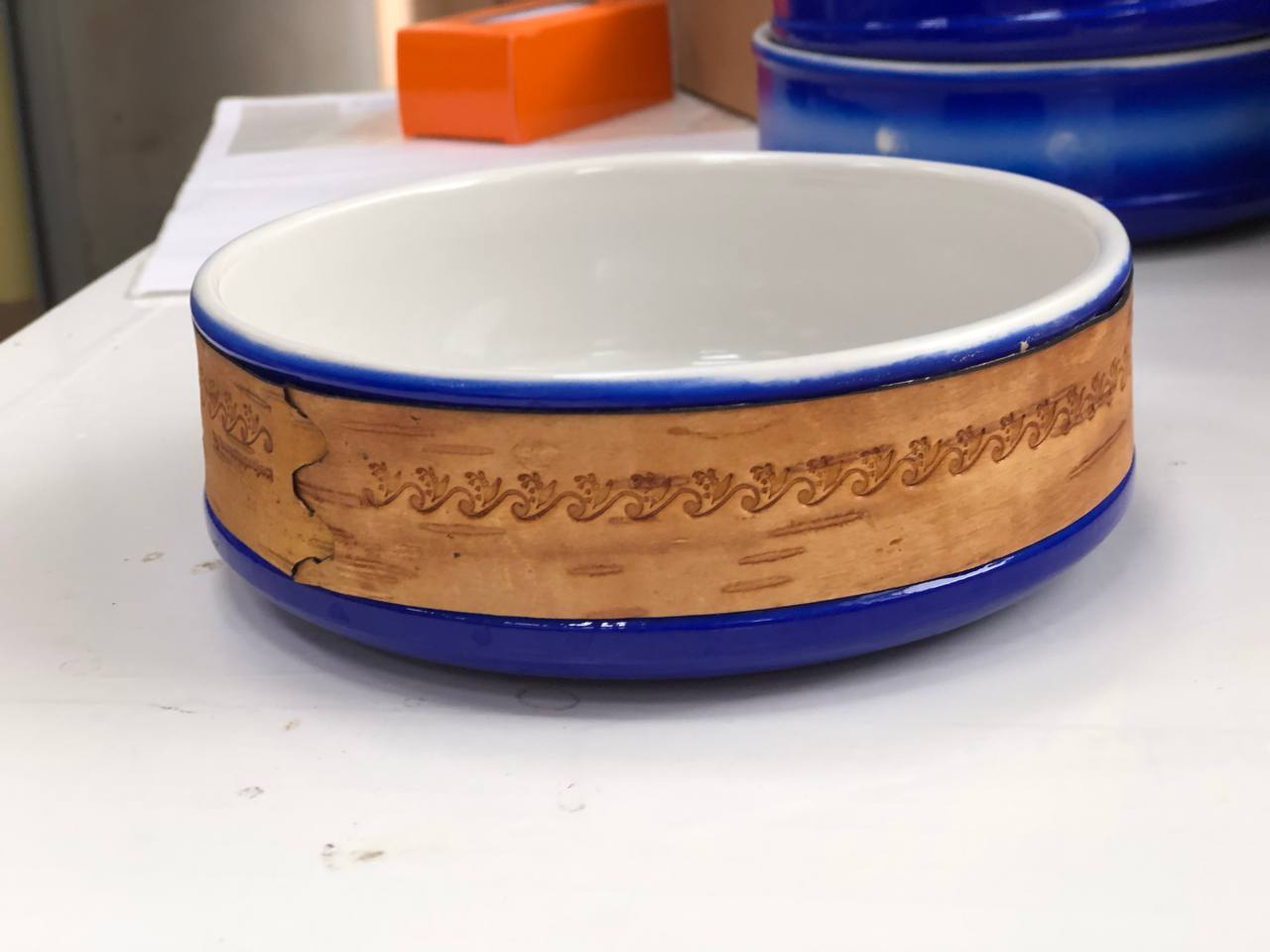 В коллекции Достоевского мы создали 3 принта: с бузиной, дубовым листом и мелкими листьями калины по мотивам растений, встречающихся в произведениях автора и его усадьбе. Для пиалы мы выбрали принт с листьями калины. Именно этот вариант литературных коллекций был отобран на выставку "Придумано и сделано в России" и экспонировался во Всероссийском Музее Декоративного Искусства. Цитаты в данном случае на бересту не наносятся.