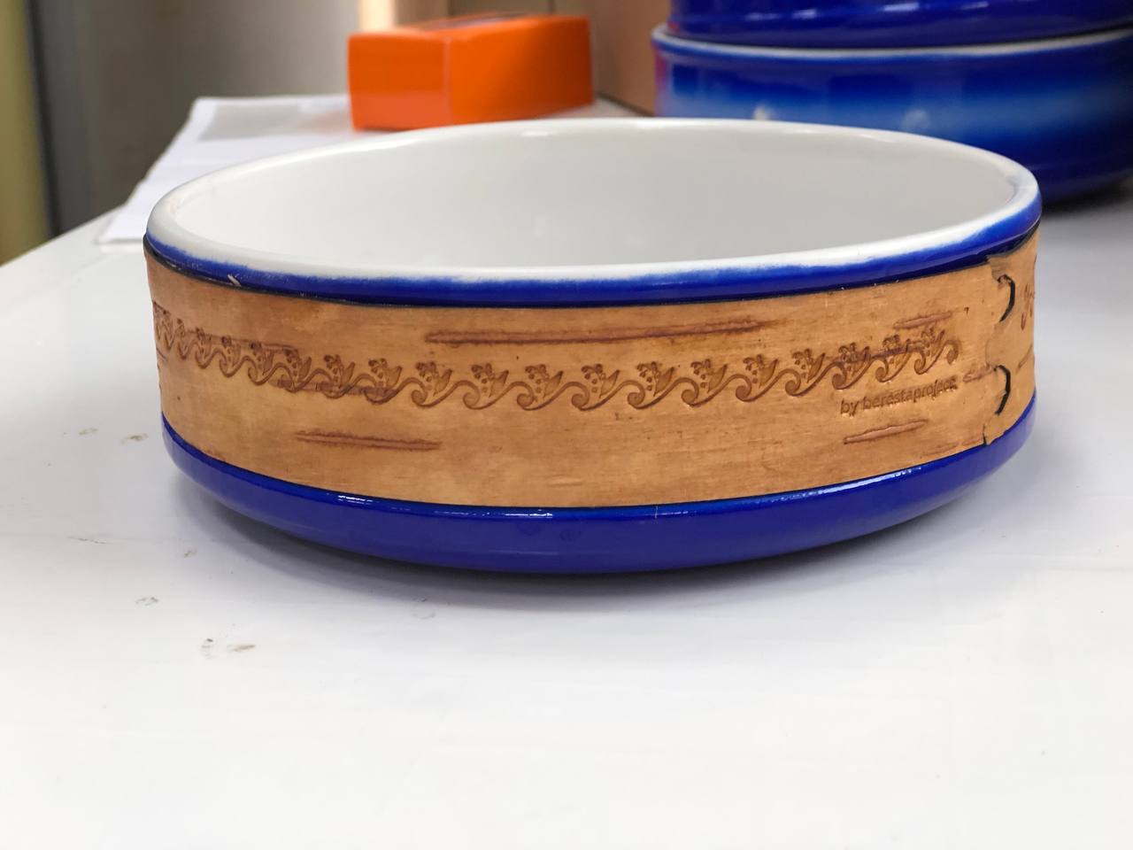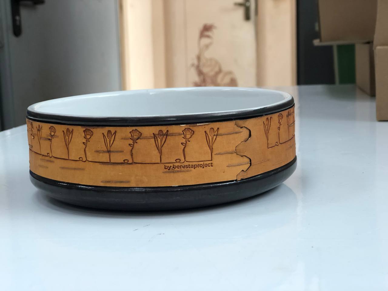 Малая белая миска или пиала by berestaproject размером 16х16х5,5, объемом 850мл и весом 700г рекомендована для завтраков с мюсли или творогом, супов и иной еды. Ее можно держать горячей в руках, не боясь обжечься; мыть в воде, не снимая бересту и ставить в посудомоечную машину или микроволновку. Пиала упаковывается в картонную коробку.